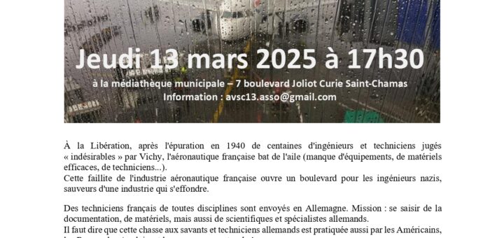 Les Amis du Vieux Saint-Chamas ont le plaisir de vous proposer une conférence à la Médiathèque de Saint-Chamas le jeudi 13 mars 2025 à 17h30, intitulée « 1945-1970, Anciens Nazis et Aéronautique française »,...