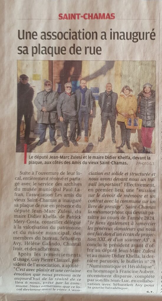 [ASSOCIATION] Inauguration de notre local par admin · Publié 21 janvier 2023 · Mis à jour 15 avril 2023 Les Amis du Vieux Saint-Chamas auront le plaisir de vous accueillir le samedi 21 janvier 2023 à 10h00 pour partager un pot de l’amitié à l’occasion de l’inauguration de notre nouveau local au Parc de la Poudrerie, rue Auguste Fabre, à Saint-Chamas.