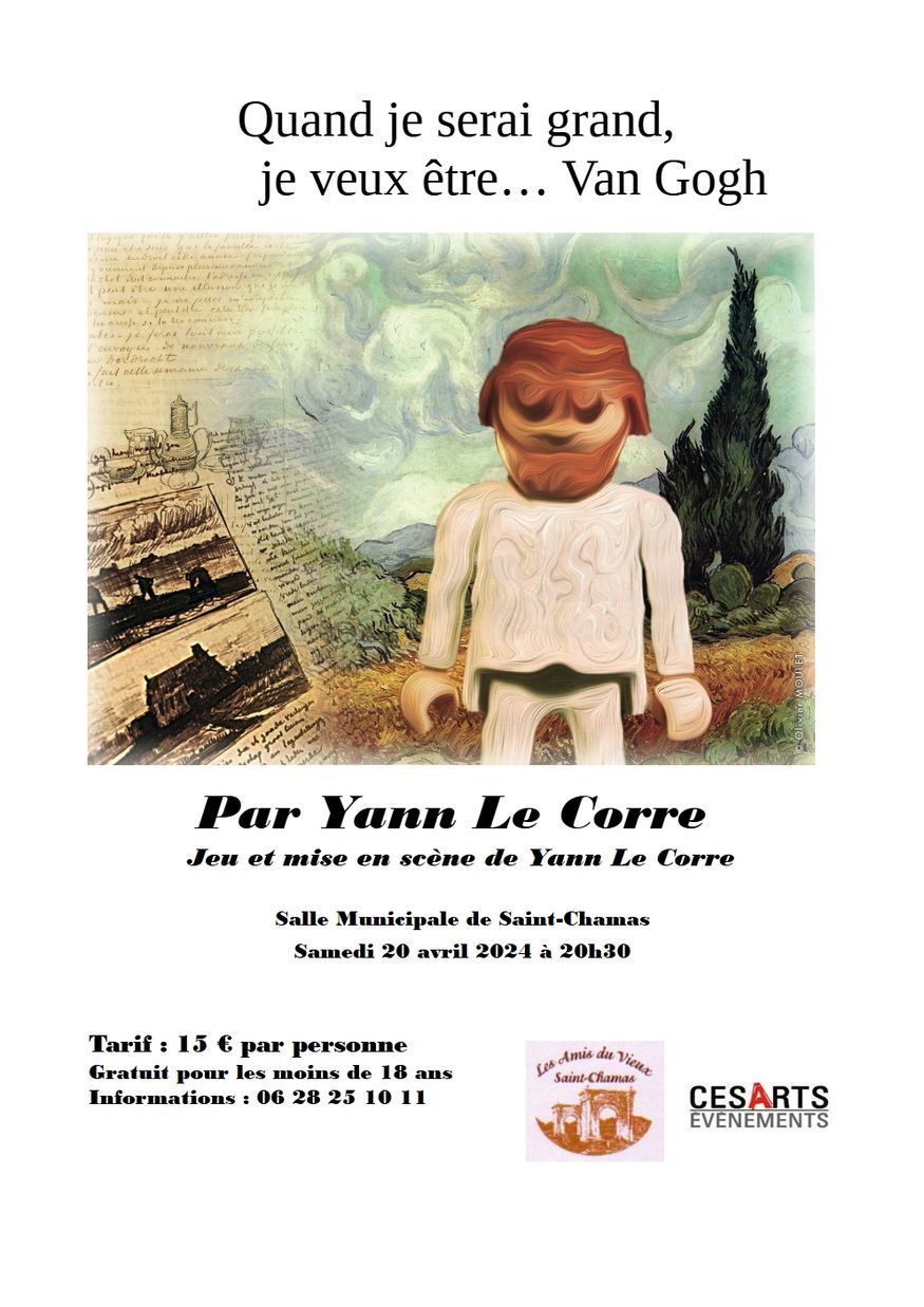 20h30 : Quand je serai grand je veux être… Van Gogh, spectacle de M. Yann Le Corre, à la Salle Municipale, 13 avenue des 53, 13250 Saint-Chamas. Tarif : 15 € par personne. Gratuit pour les moins de 18 ans.