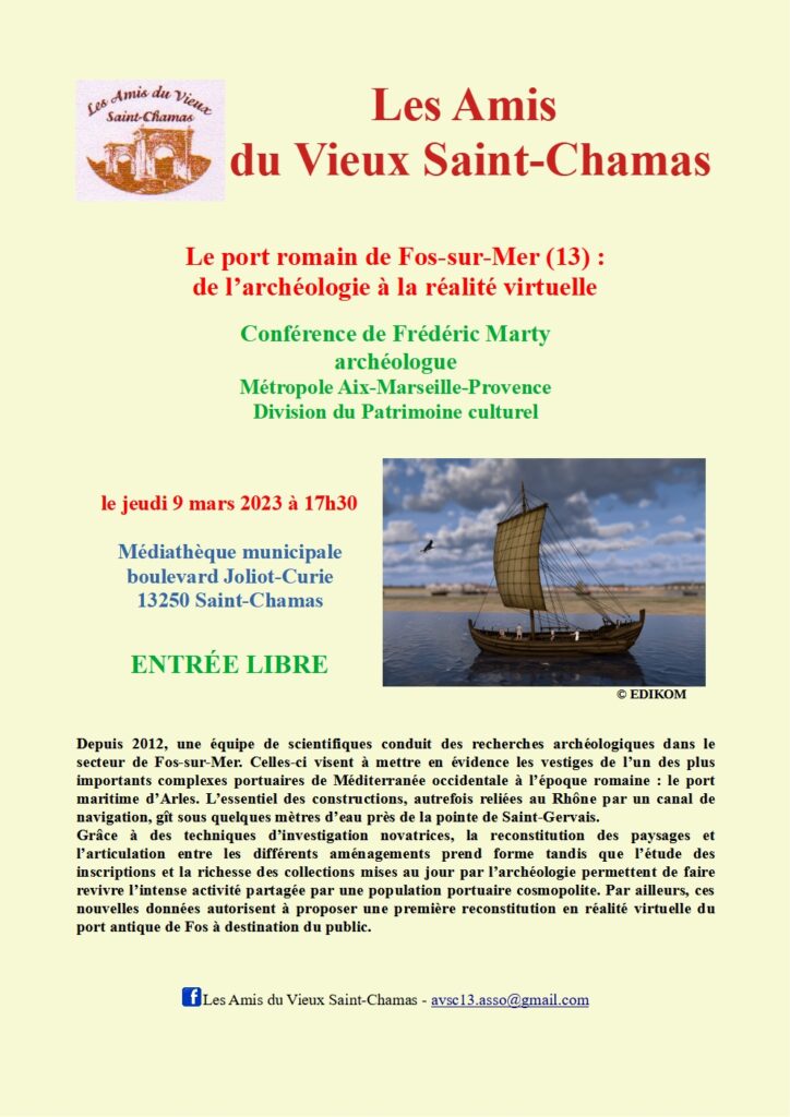 Les Amis du Vieux Saint-Chamas ont le plaisir de vous proposer une conférence à la Médiathèque de Saint-Chamas le jeudi 09 mars 2023 à 17h30, intitulée « Le port romain de Fos-sur-Mer (13) : de l’archéologie à la réalité virtuelle« , animée par Frédéric Marty, archéologue.