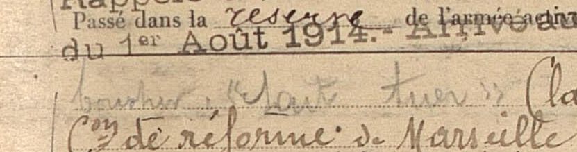 Passé service armée, déclaré apte par décision de la commission spéciale de Marseille le 25 mai 1916. Passé au 3e régiment d’artillerie coloniale le 17 juin 1916.