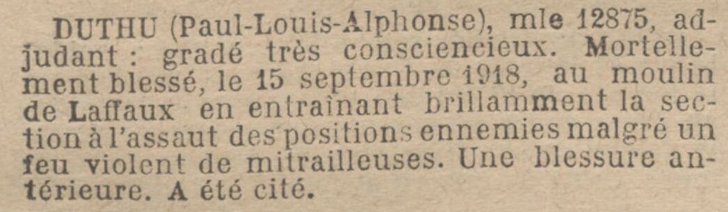 Mort pour la France, des suites de ses blessures, le 21 décembre 1916 au centre hospitalier de Chaumont-sur-Aire (Meuse).