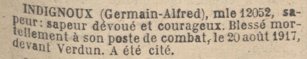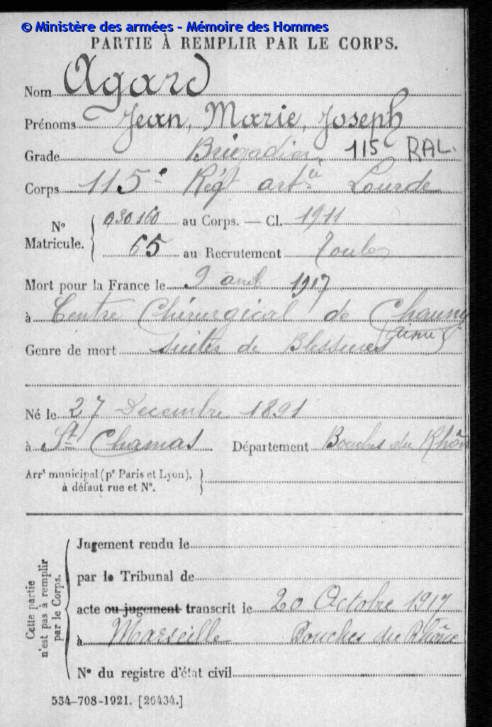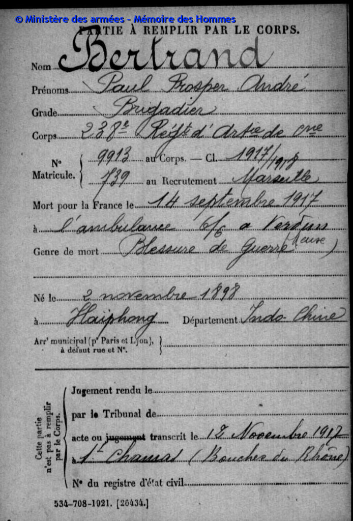 Mort pour la France, des suites de ses blessures de guerre, le 14 septembre 1917 à l’ambulance 6/6 à Verdun (Meuse).