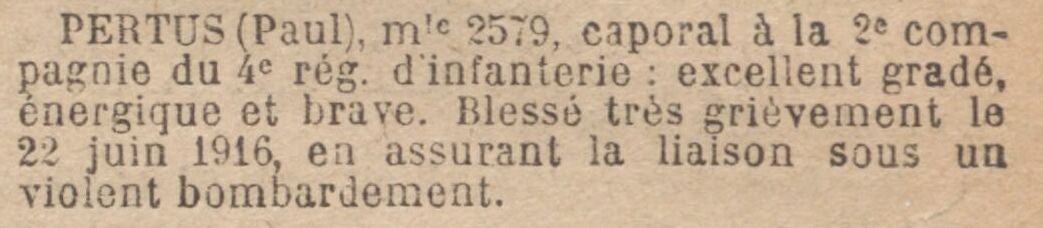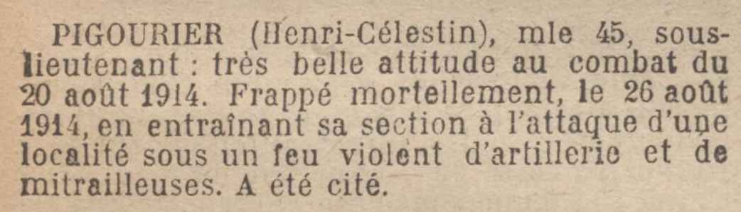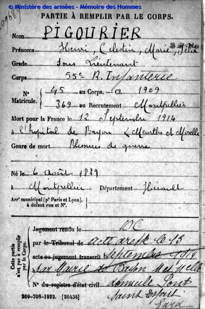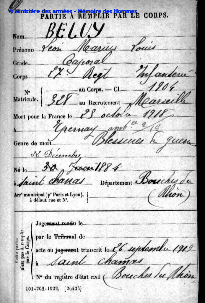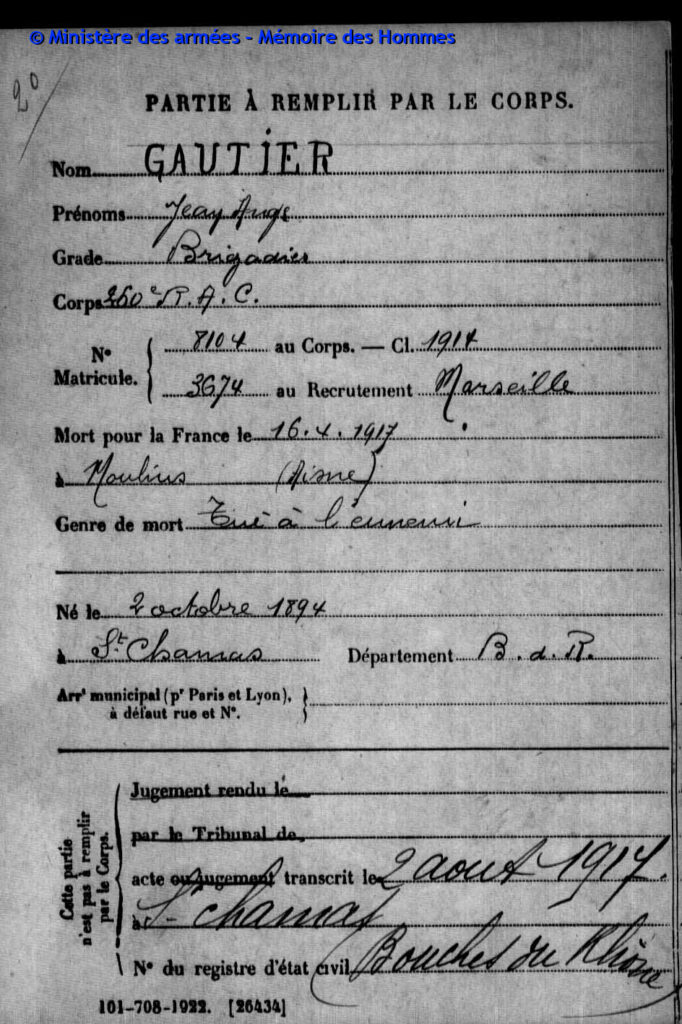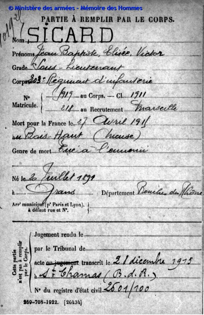 Sous-lieutenant à la 22e compagnie du 203e régiment d’infanterie, matricule n°218 au recrutement de Marseille, classe 1911.