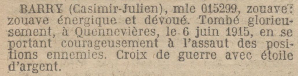 Cité à l’ordre de l’armée, Journal officiel du 15 juin 1915 : « Glorieusement tombé en entraînant sa section au cri de ¨ Vive la France, en avant¨ » .