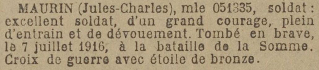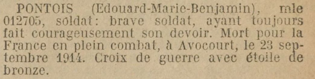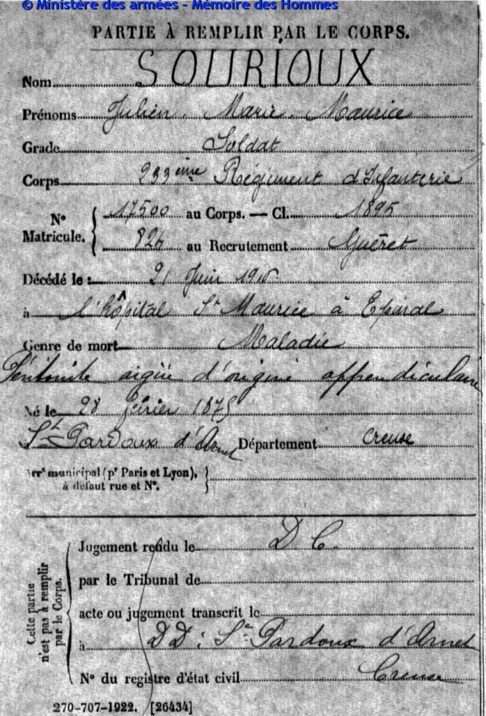 Mort pour la France, des suites de maladie contractée en service (péritonite aigü), le 21 juin 1916 à l’hôpital Saint-Maurice d’Épinal (Vosges).