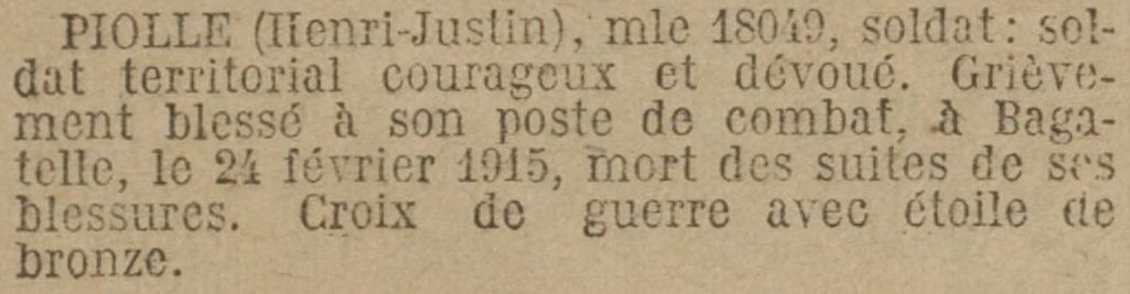 Mort pour la France, tué à l’ennemi, le 27 avril 1915 au combat du Bois-Haut, à la tranchée de Calonne près Les Éparges (Meuse).