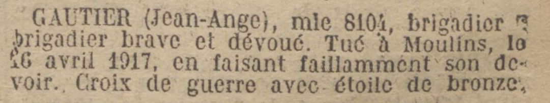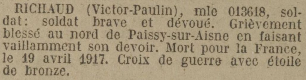 Mort pour la France, tué à l’ennemi, le 22 juin 1917 aux tranchées devant Braye-en-Laonnois (Aisne).