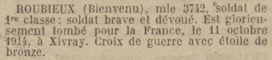 Mort pour la France, disparu présumé tué à l’ennemi, le 11 octobre 1914 à Xivray (Meuse).