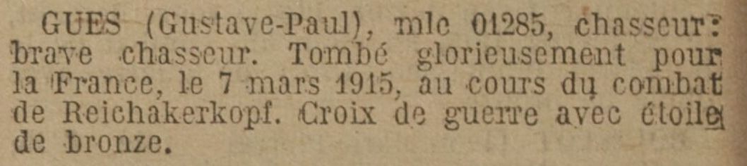 Mort pour la France, tué à l’ennemi, le 26 mars 1916 à Barrenkopf (Haut-Rhin).