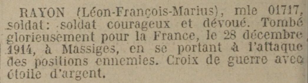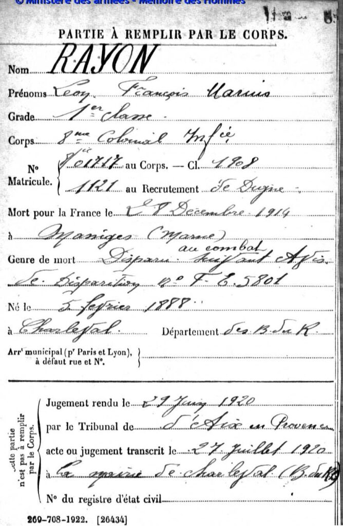Mort pour la France, tué à l’ennemi par arme à feu, le 20 décembre 1914 aux environs de Raffécourt (Meuse).
