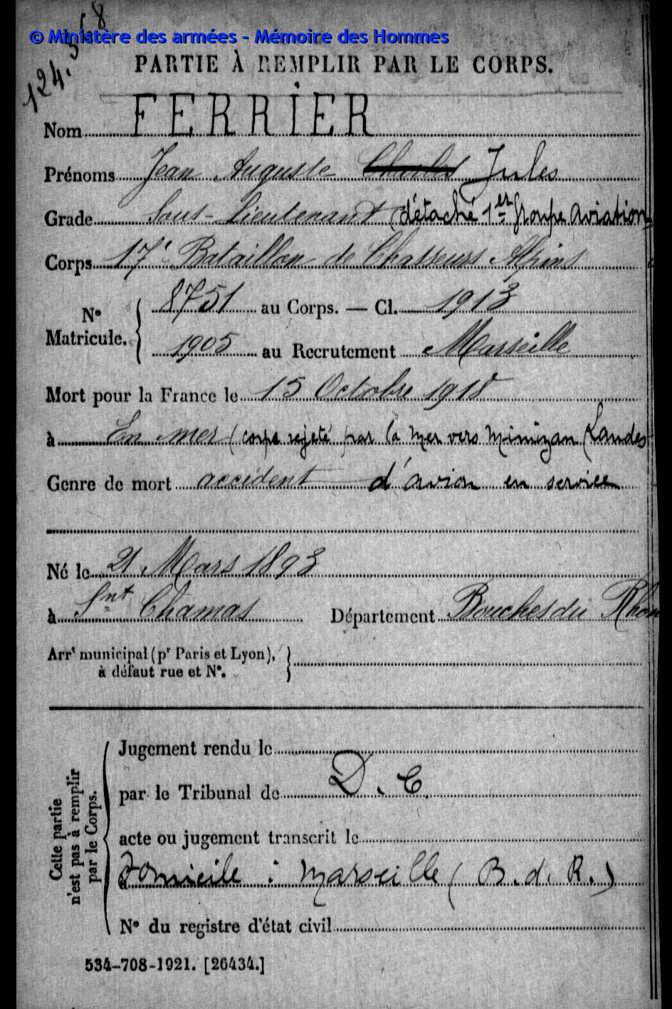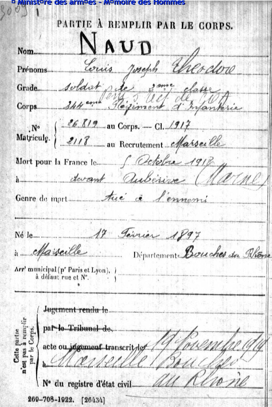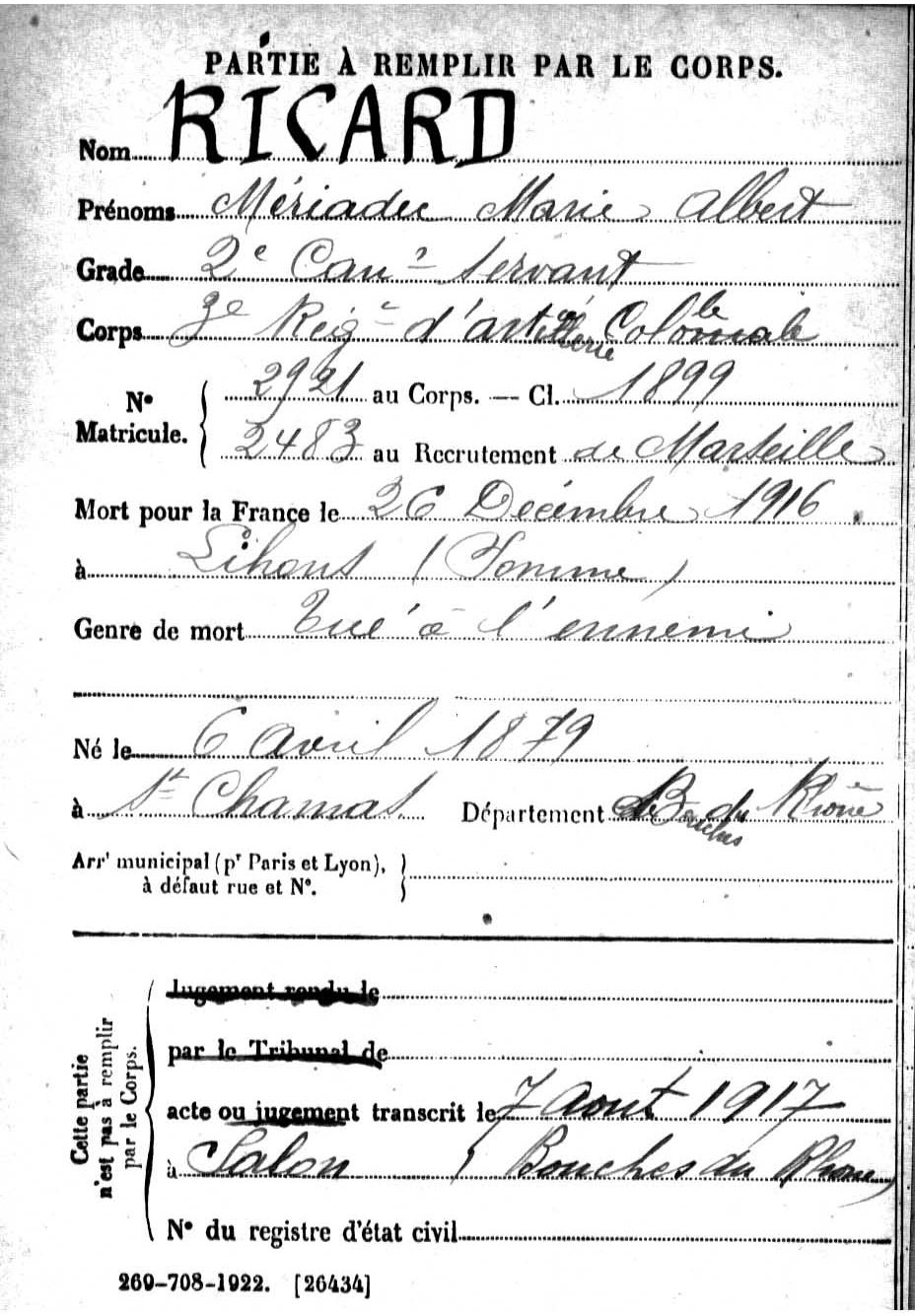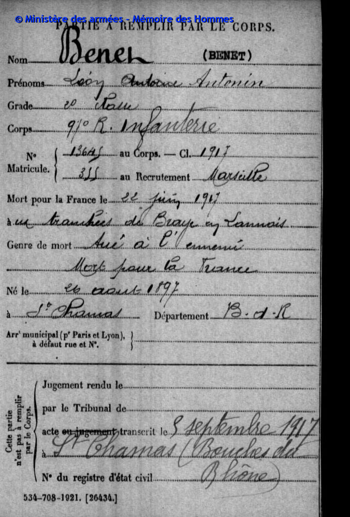 Acte de décès transcrit le 20 octobre 1917 à Marseille (Bouches-du-Rhône).