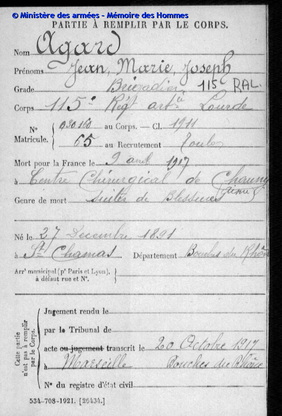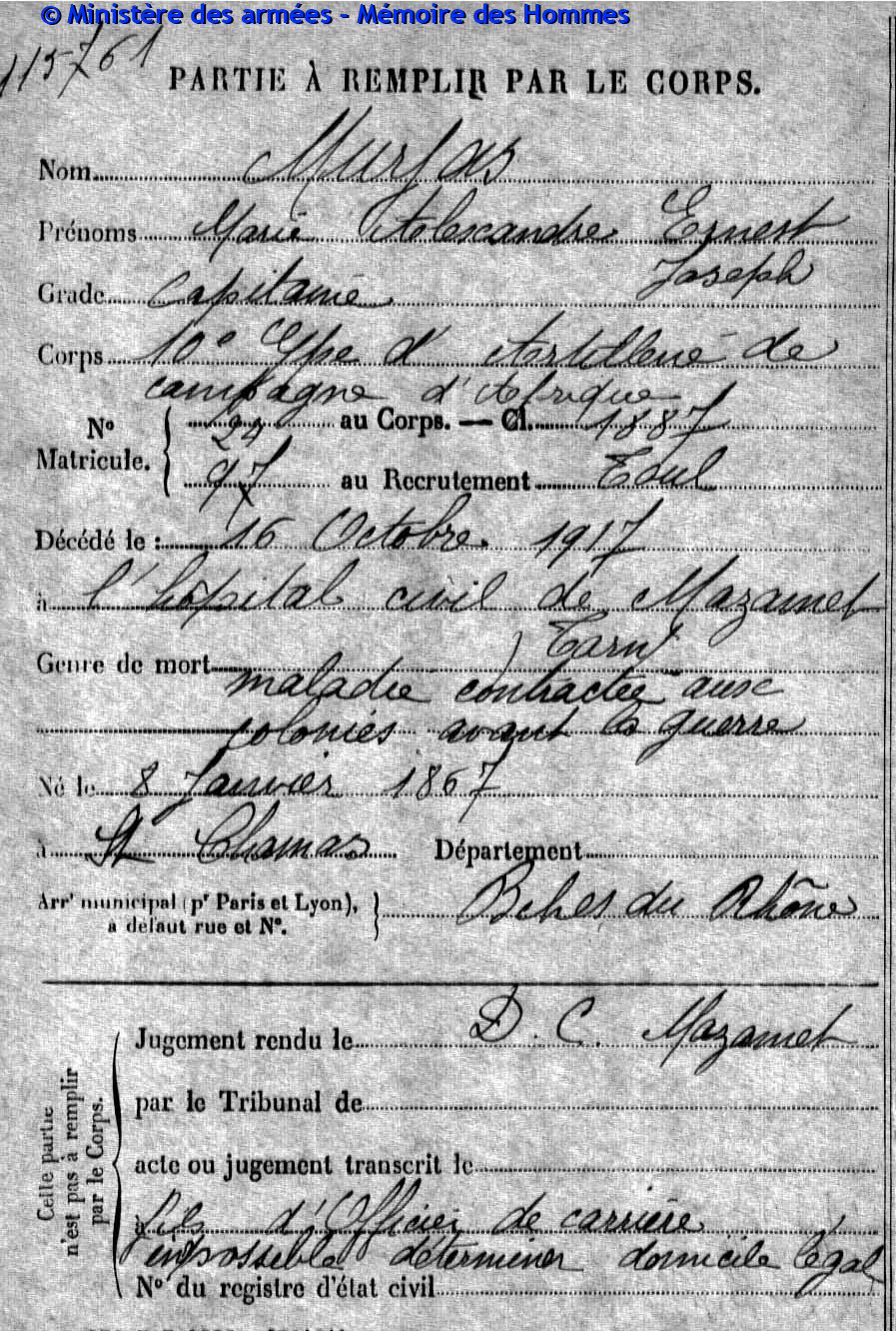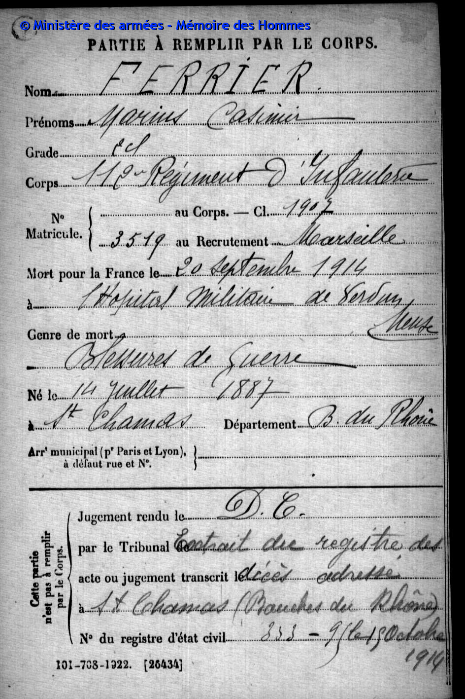 Acte de décès transcrit le 20 octobre 1917 à Marseille (Bouches-du-Rhône).