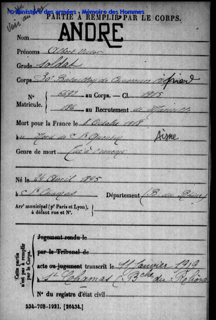 Mort pour la France, tué à l’ennemi, le 8 octobre 1918 au nord de Saint-Quentin (Aisne)