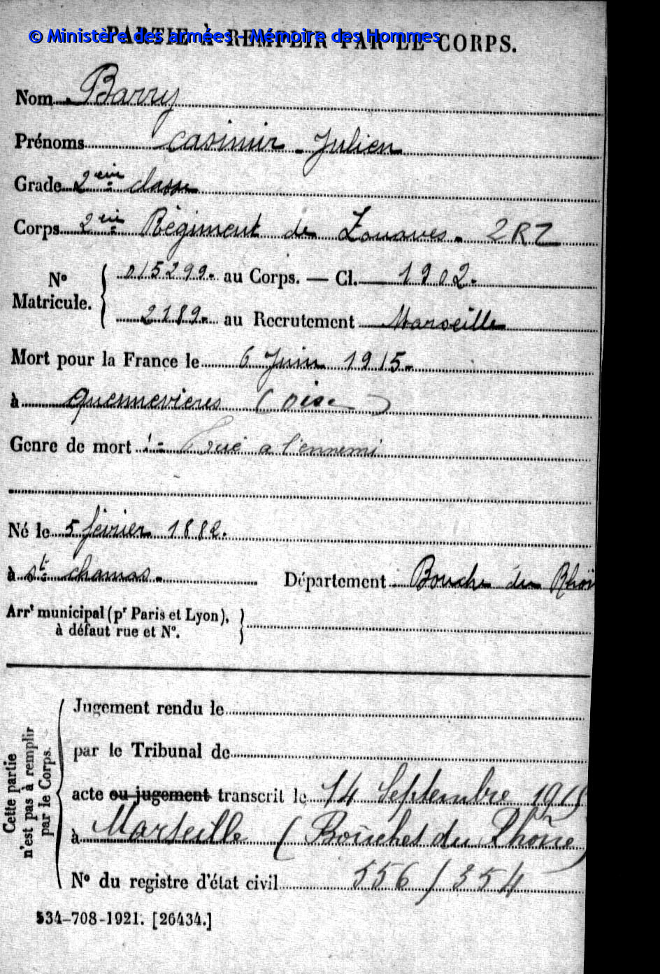 Acte de décès transcrit le 14 septembre 1915 à Marseille (Bouches-du-Rhône).