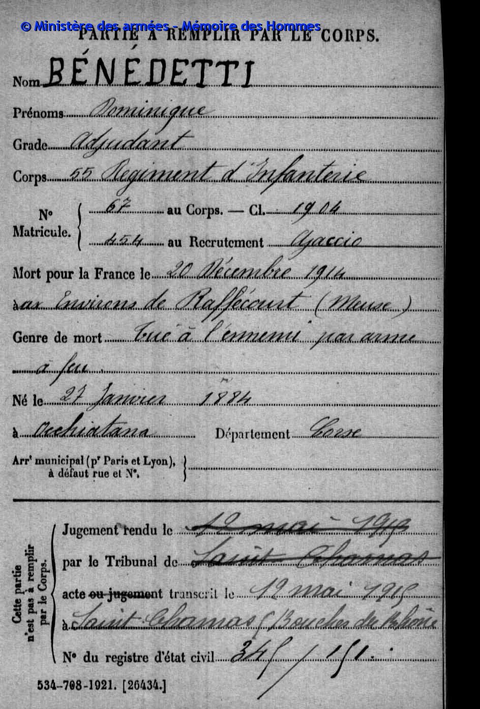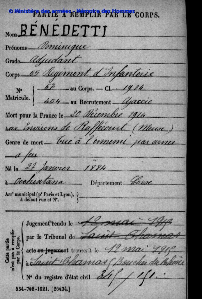 Adjudant au 55e régiment d’infanterie, 2e compagnie, matricule n°454 au recrutement d’Ajaccio, classe 1902.