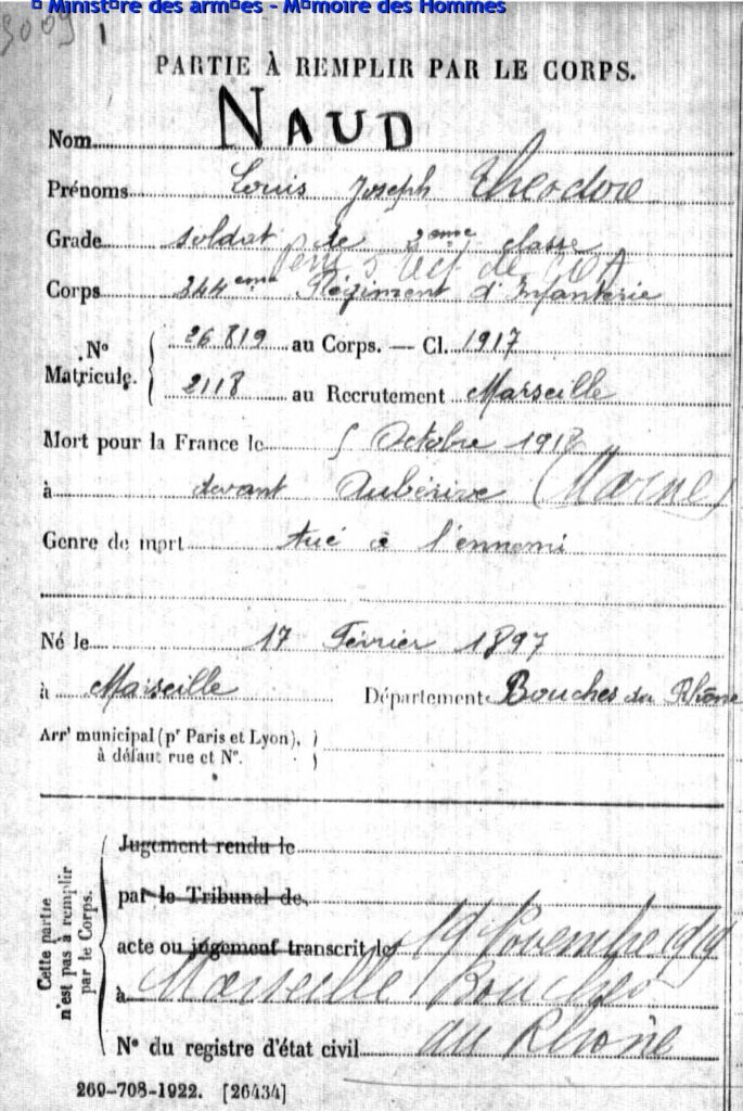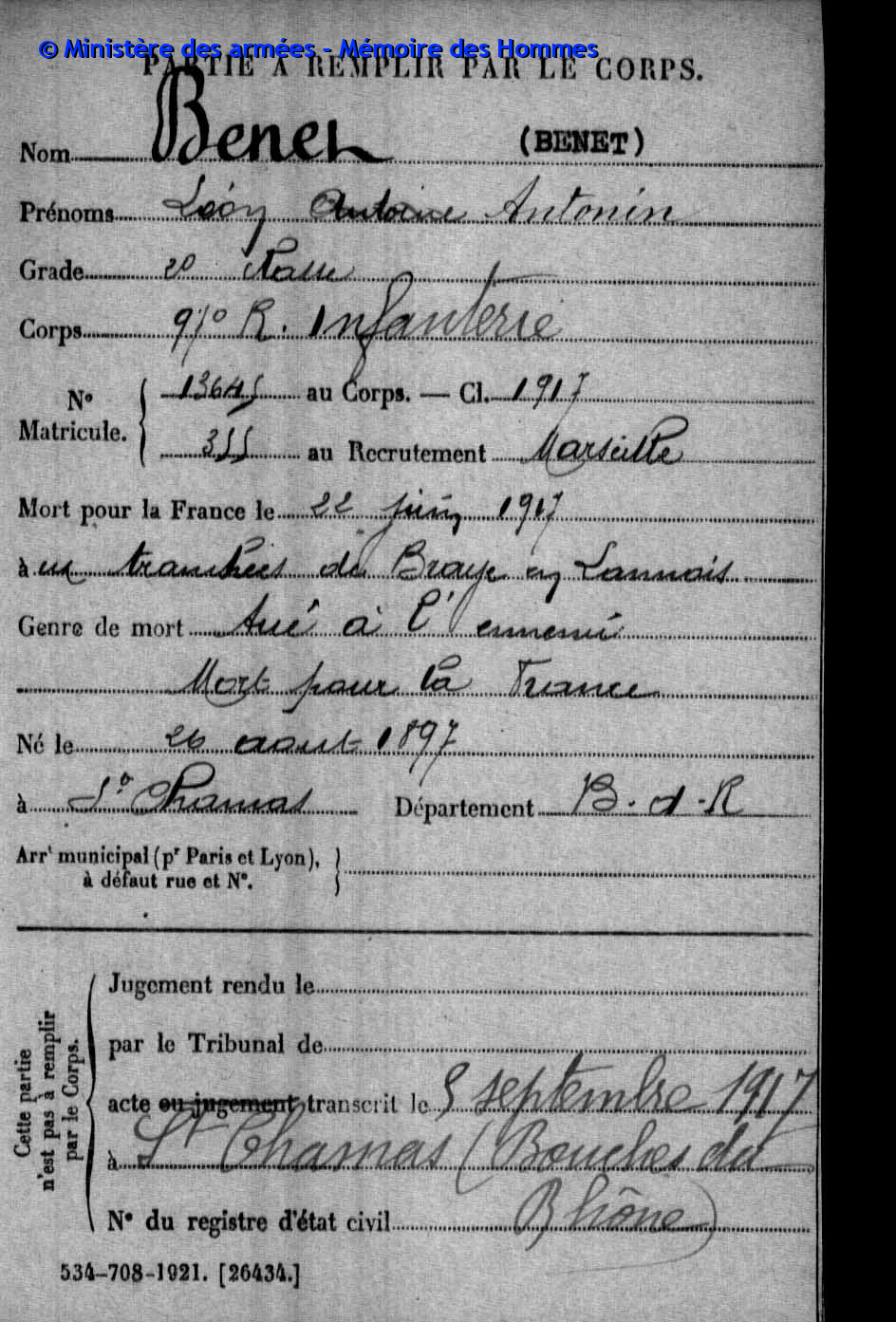 Soldat de 2e classe au 97e régiment d’infanterie, matricule n°355 au recrutement de Marseille, classe 1917.