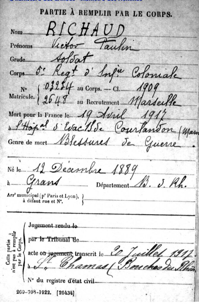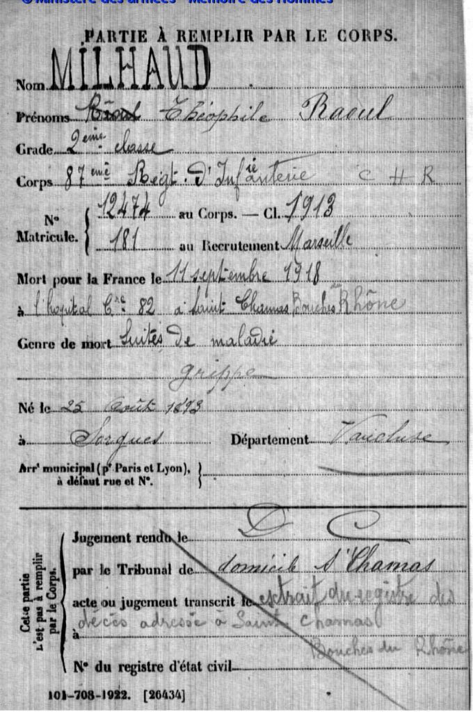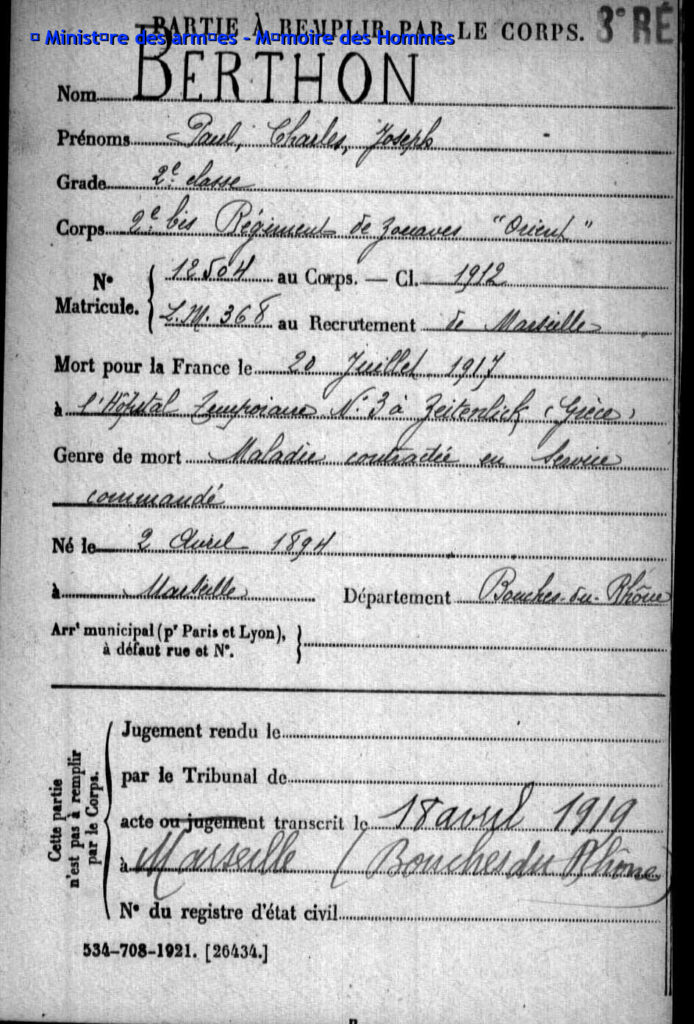 Mort pour la France, des suites de maladie contractée en service, le 20 juillet 1917 à l’hôpital temporaire n°3 à Zeitenlick (Grèce).