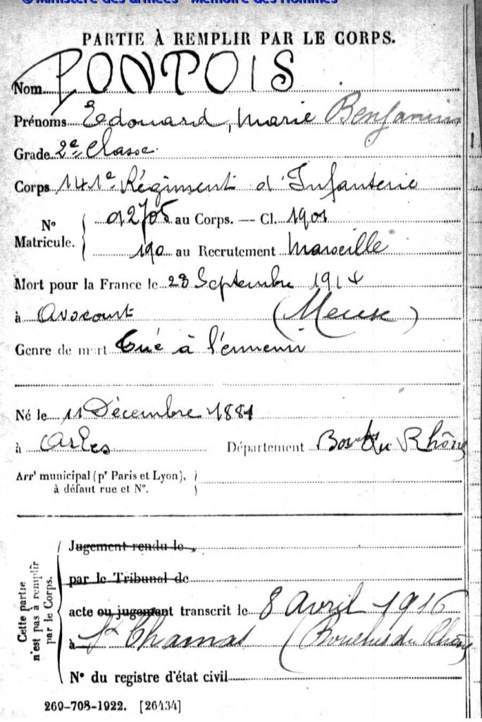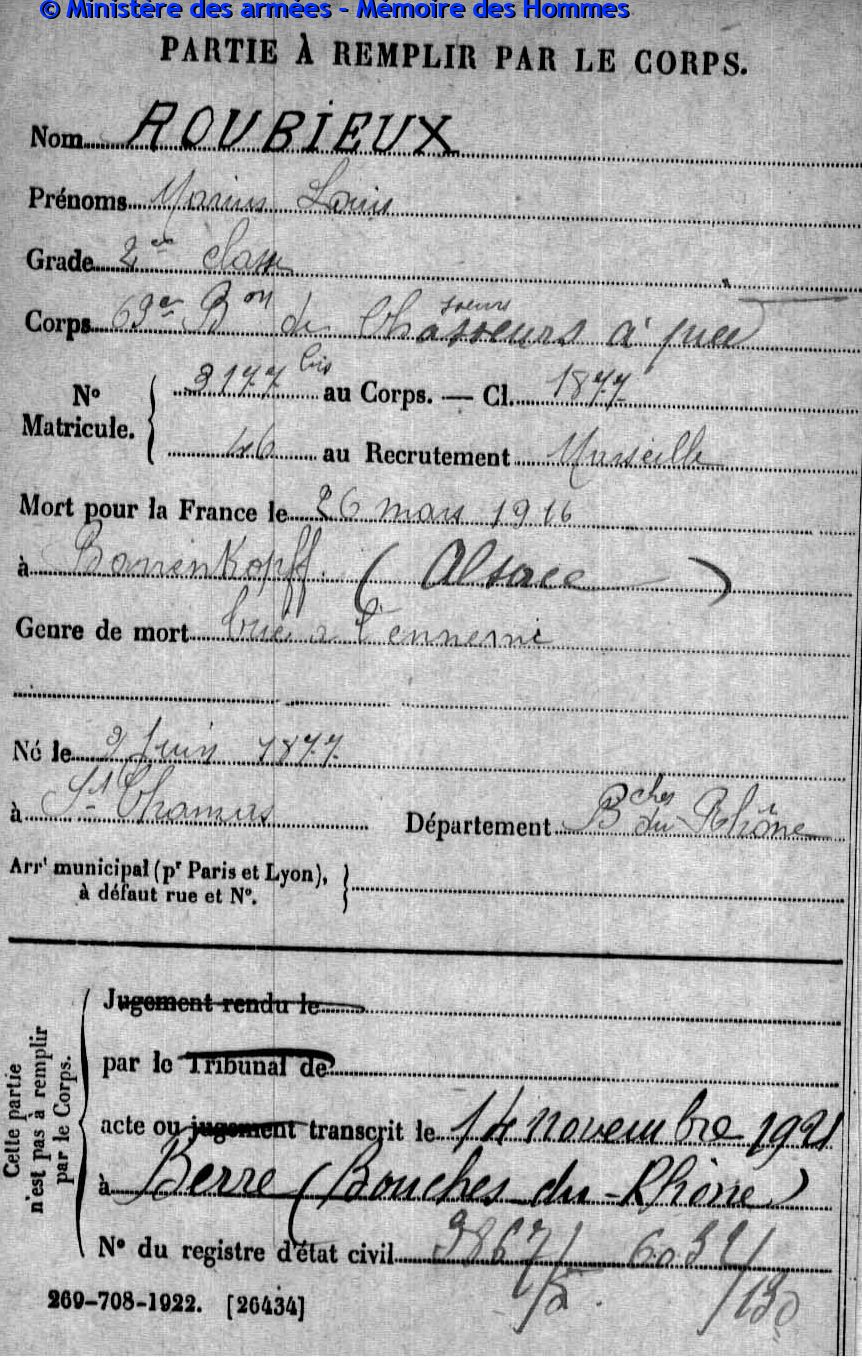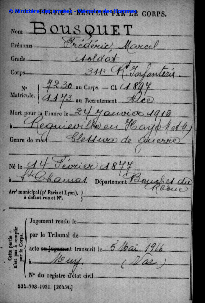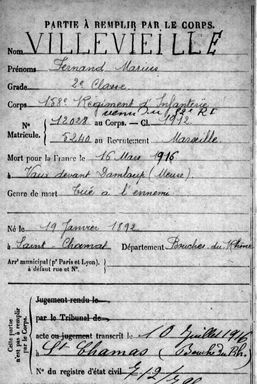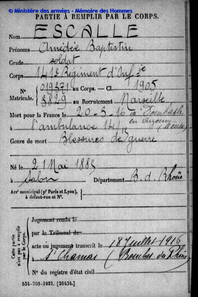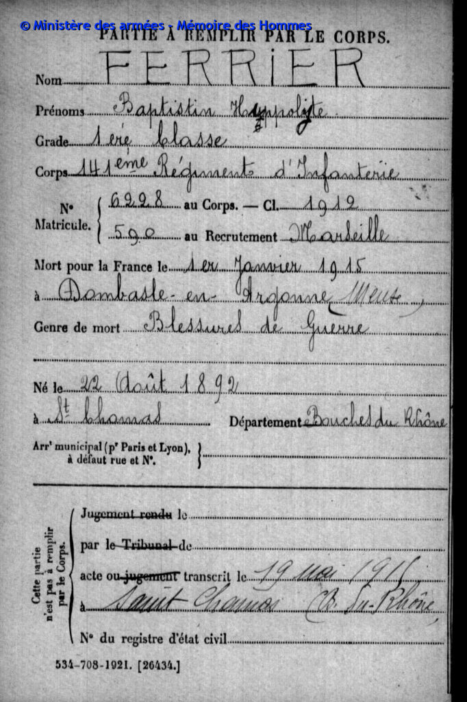Acte de décès dressé le 21 juin 1916 à Épinal (Vosges), transcrit le 18 juillet 1916 à Saint-Chamas (Bouches-du-Rhône).