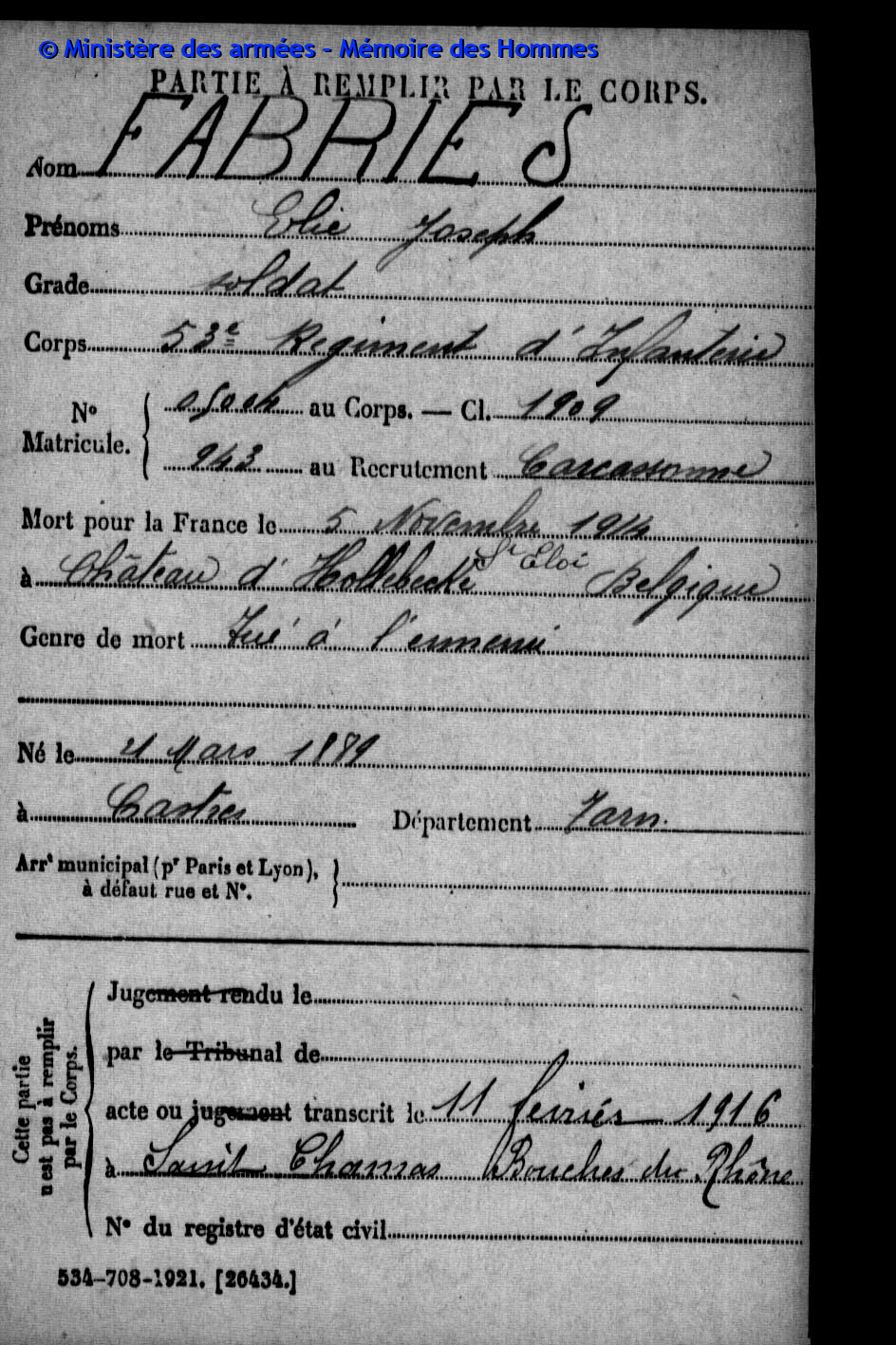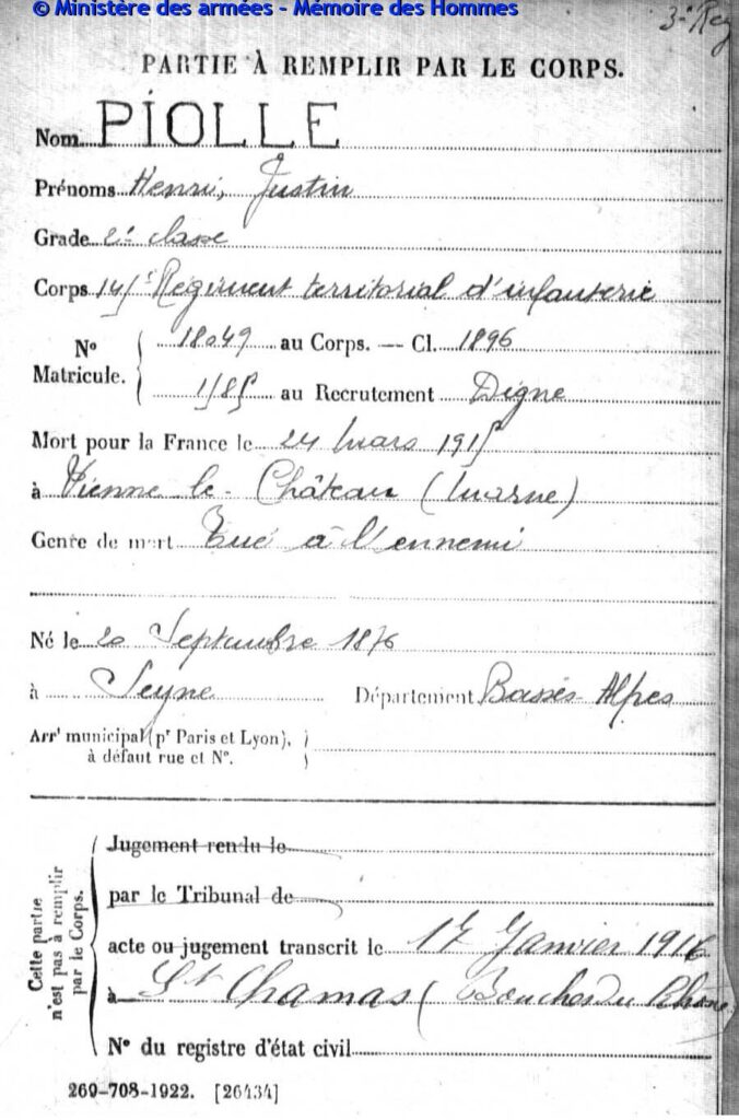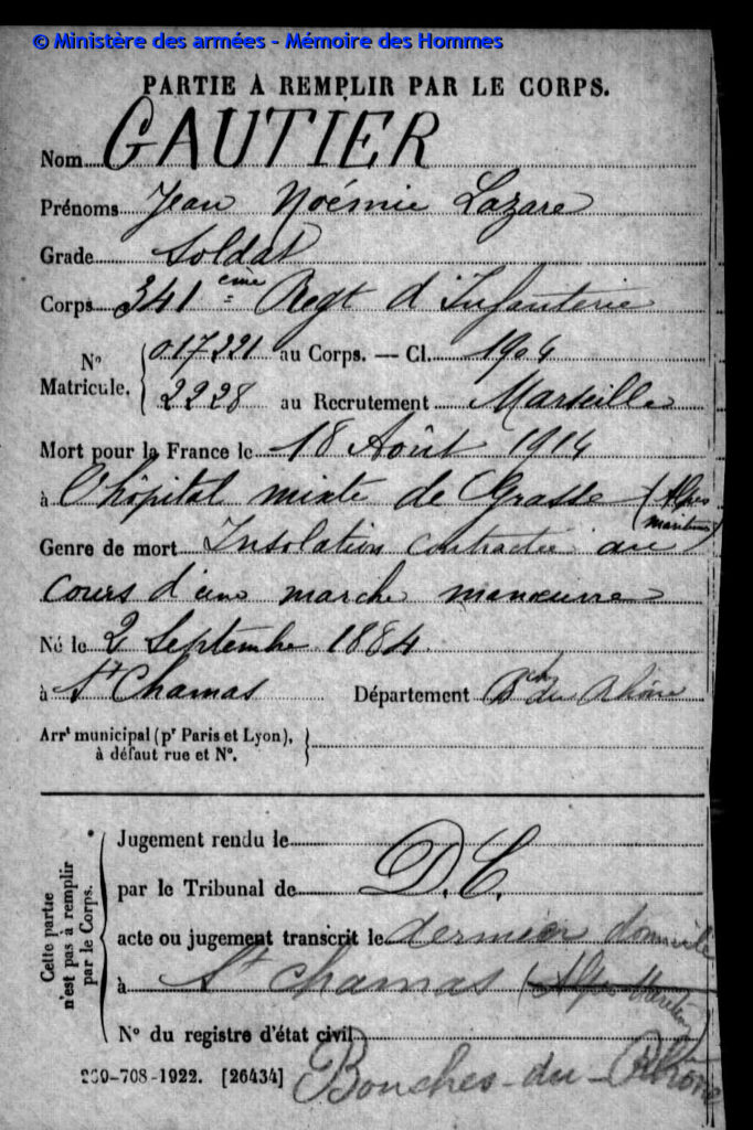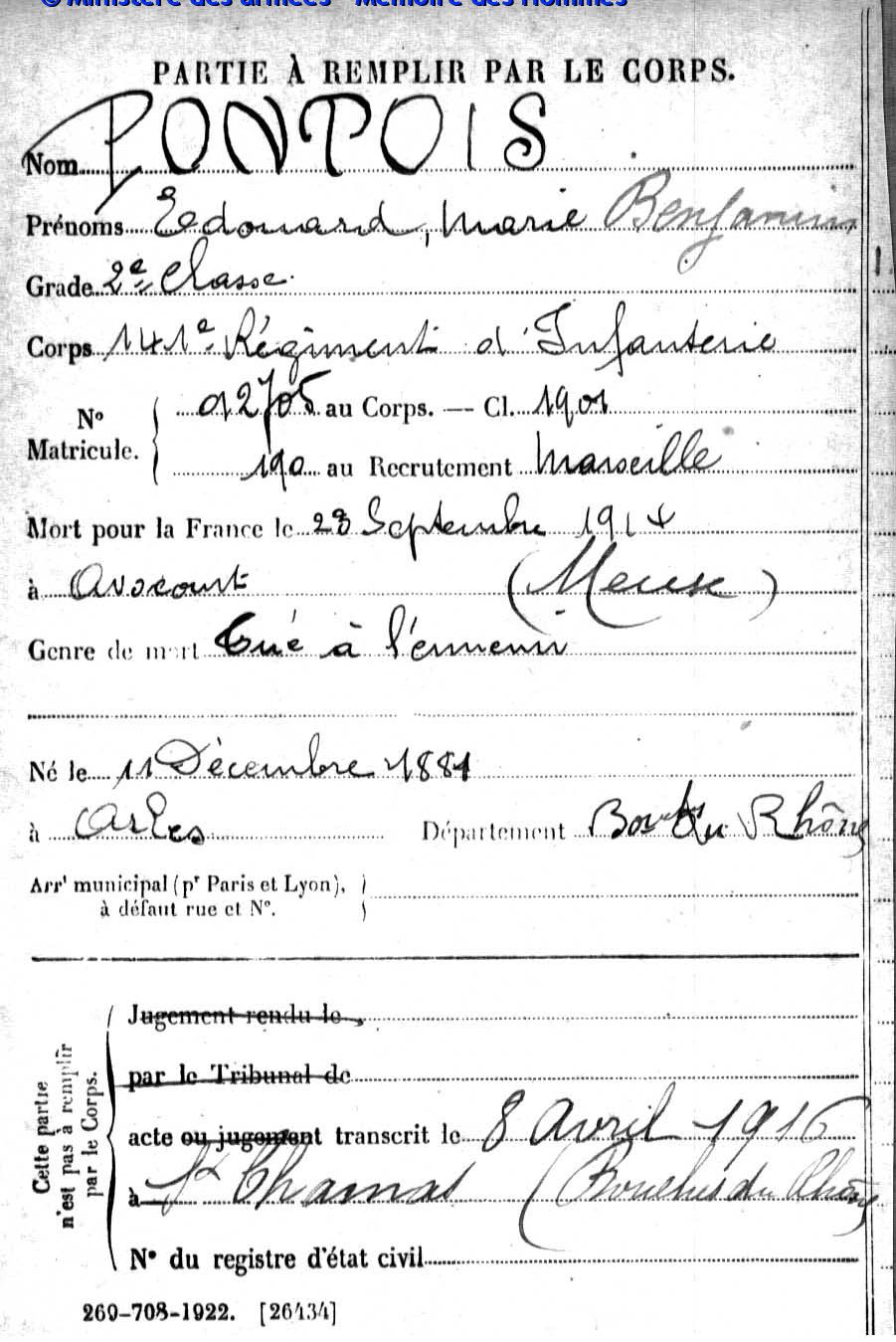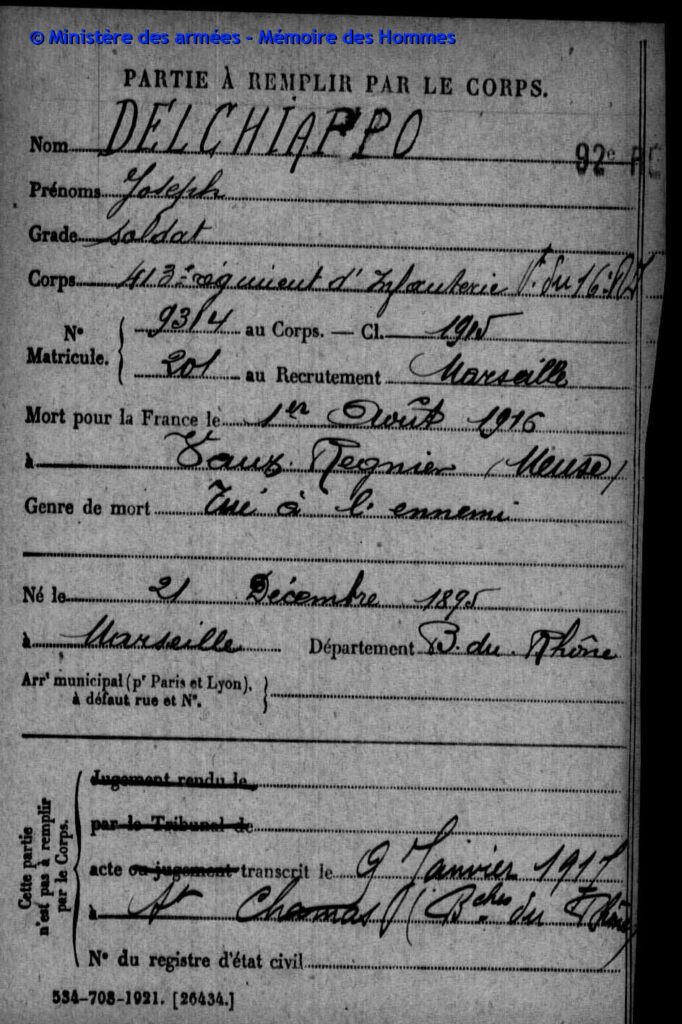 Acte de décès dressé le 21 juin 1916 à Épinal (Vosges), transcrit le 18 juillet 1916 à Saint-Chamas (Bouches-du-Rhône).