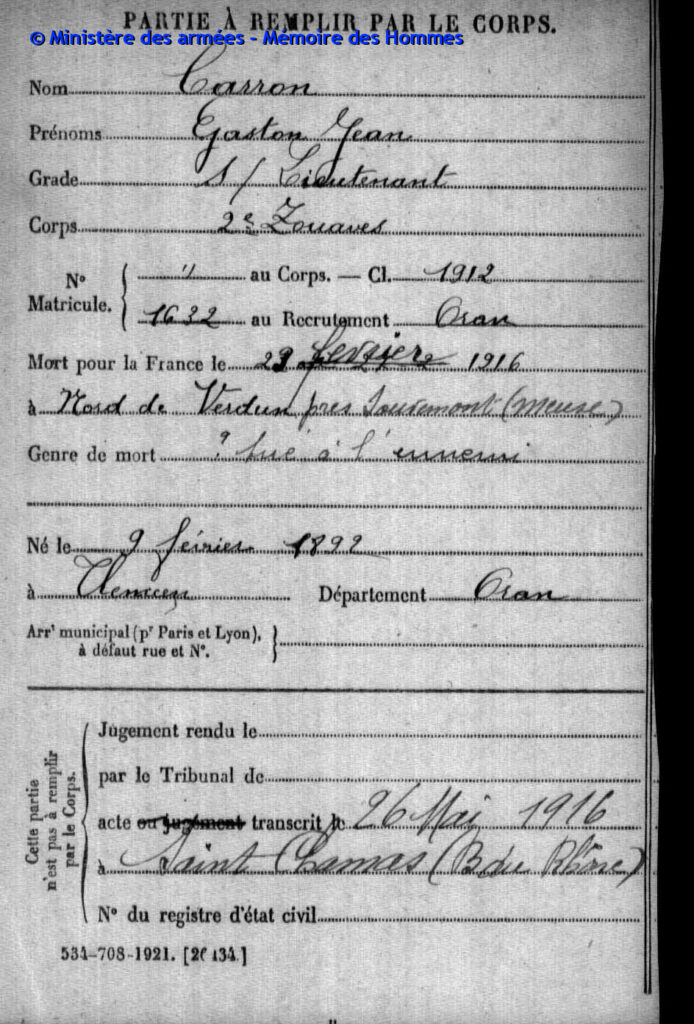Sous-lieutenant au 2e régiment de marche de zouaves, compagnie de mitrailleuses, matricule n°1632 au recrutement d’Oran, classe 1912.