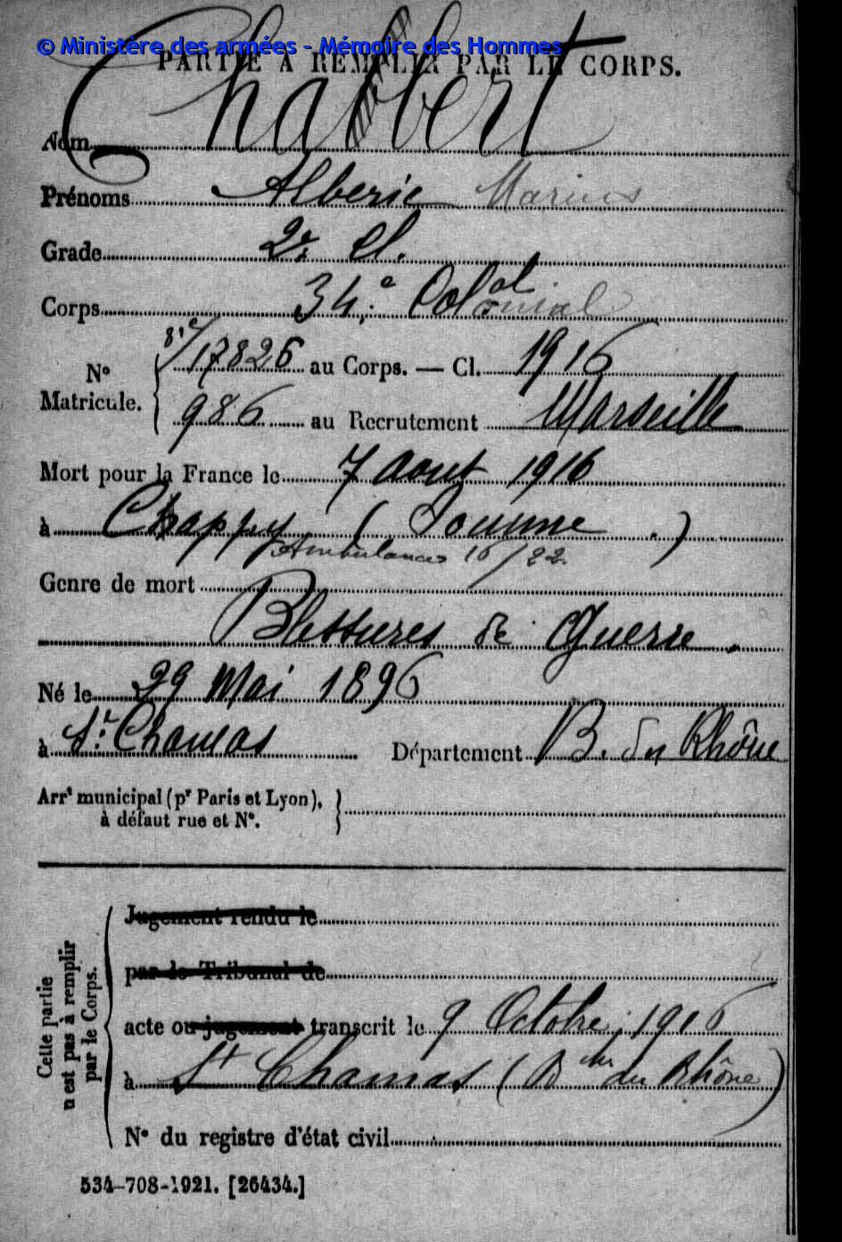 Marsouin de 2e classe au 34e régiment d’infanterie coloniale, 18e compagnie, matricule n°986 au recrutement de Marseille, classe 1916.