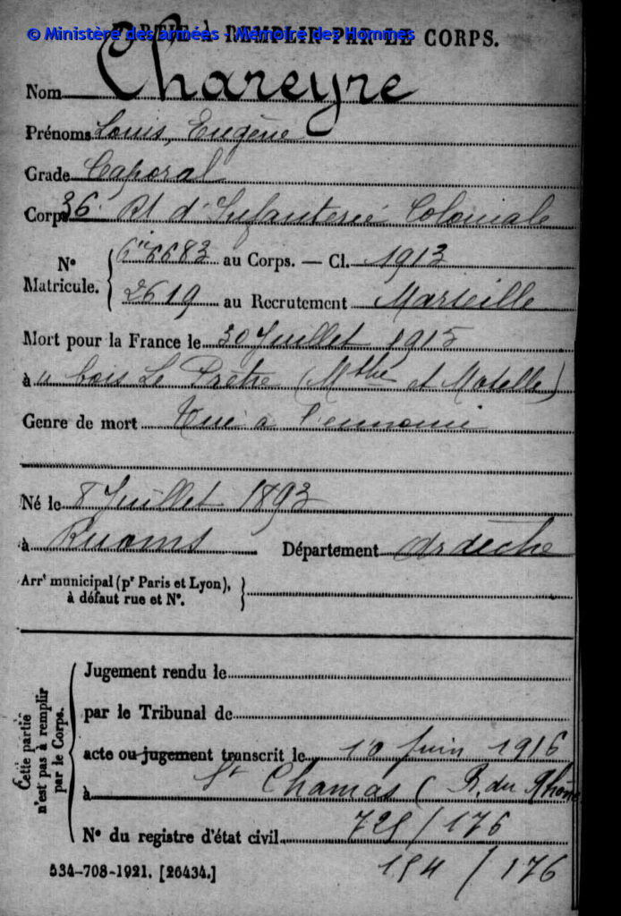 Mort pour la France, des suites de ses blessures de guerre, le 24 janvier 1916 à Regniéville-en-Haye (Meurthe-et-Moselle).