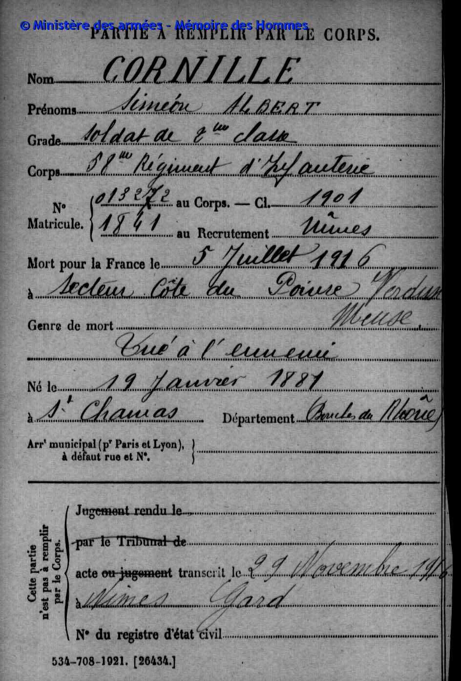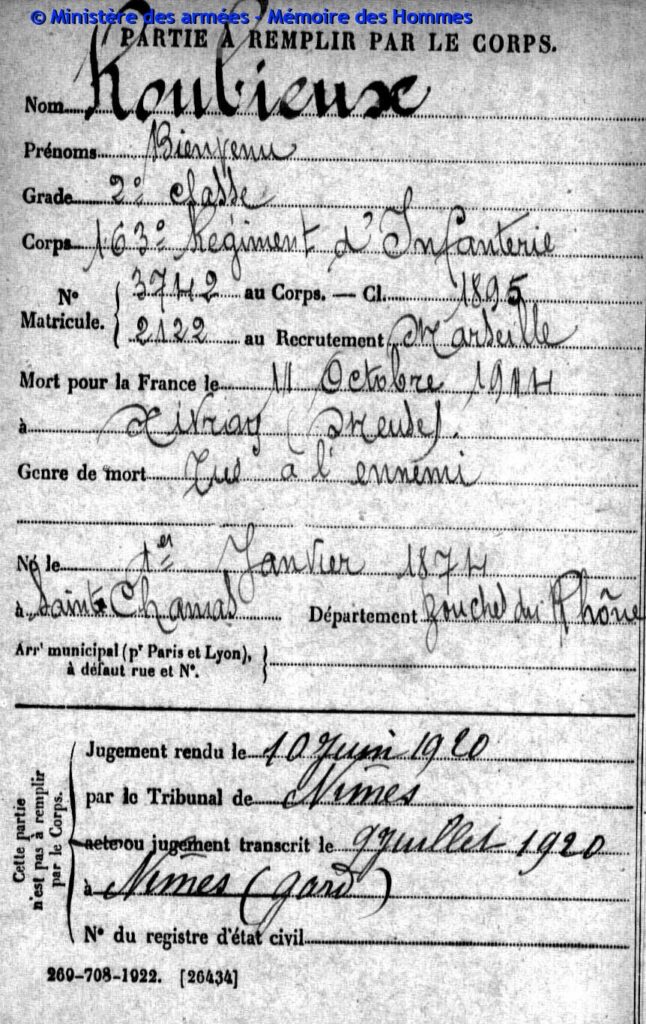 Jugement déclaratif de décès par le tribunal civil de Nîmes le 10 juin 1920, transcrit le 9 juillet 1920 à Nîmes (Gard).