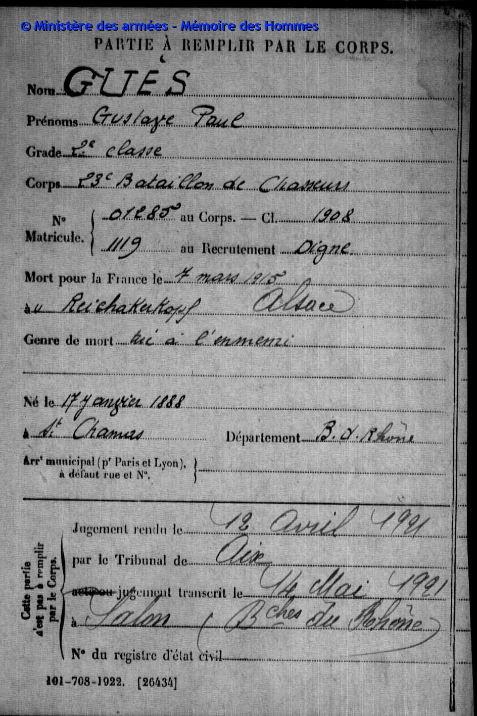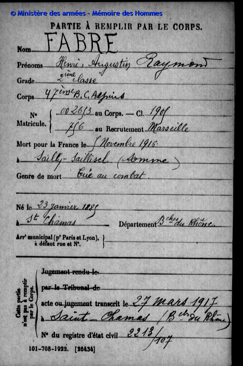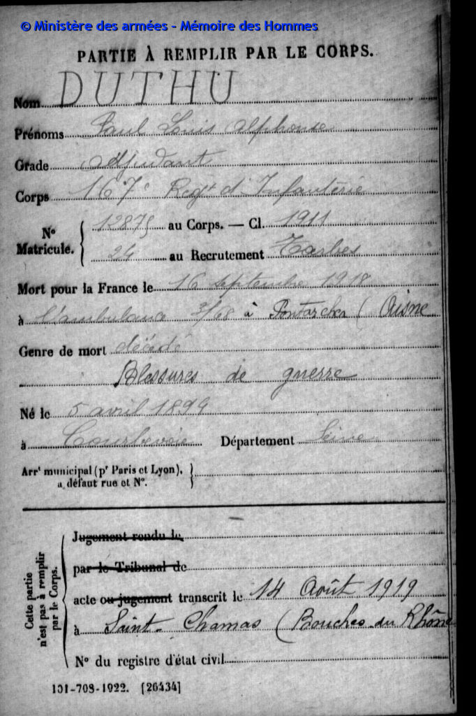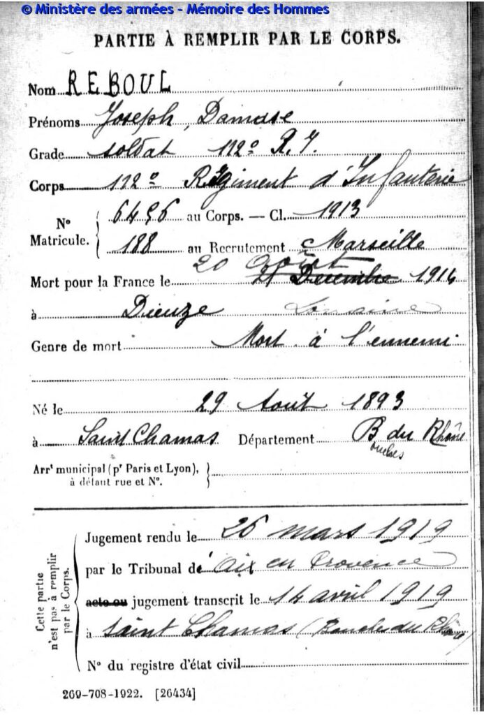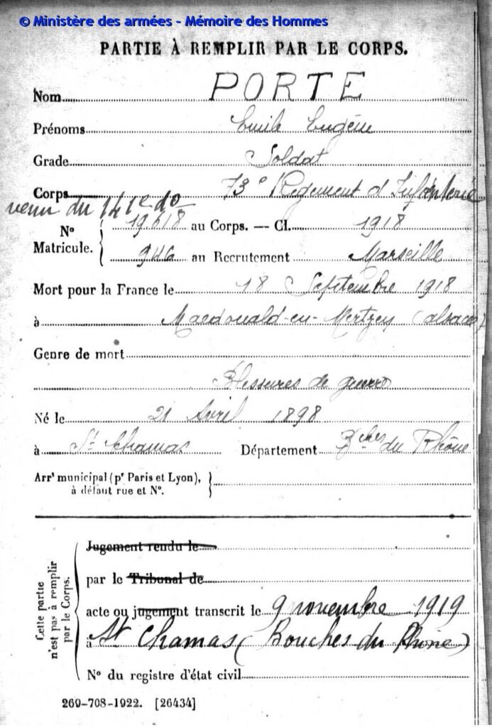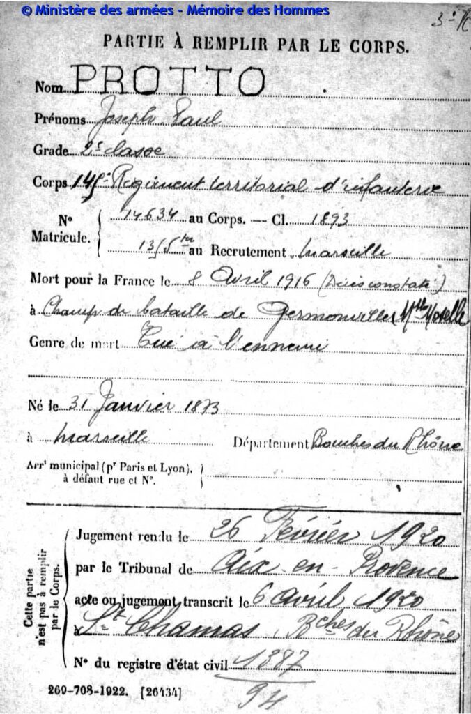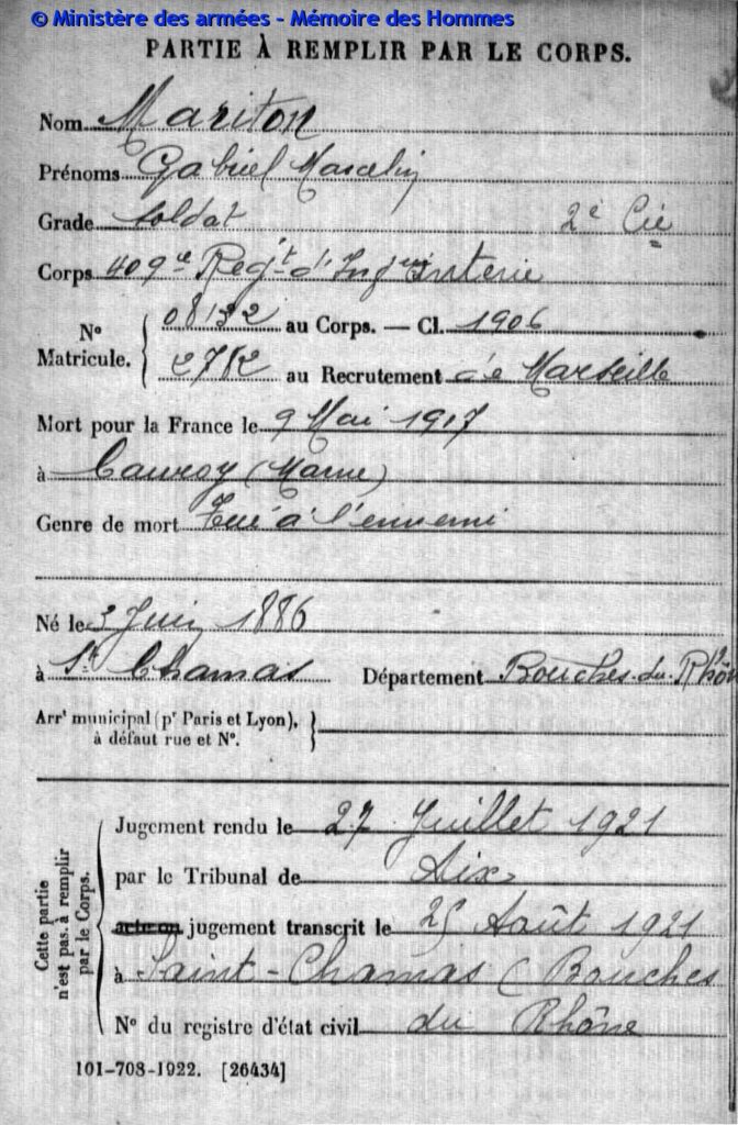 Jugement déclaratif de décès par le tribunal civil d’Aix le 26 mars 1919, transcrit le 16 avril 1919 à Saint-Chamas (Bouches-du-Rhône).