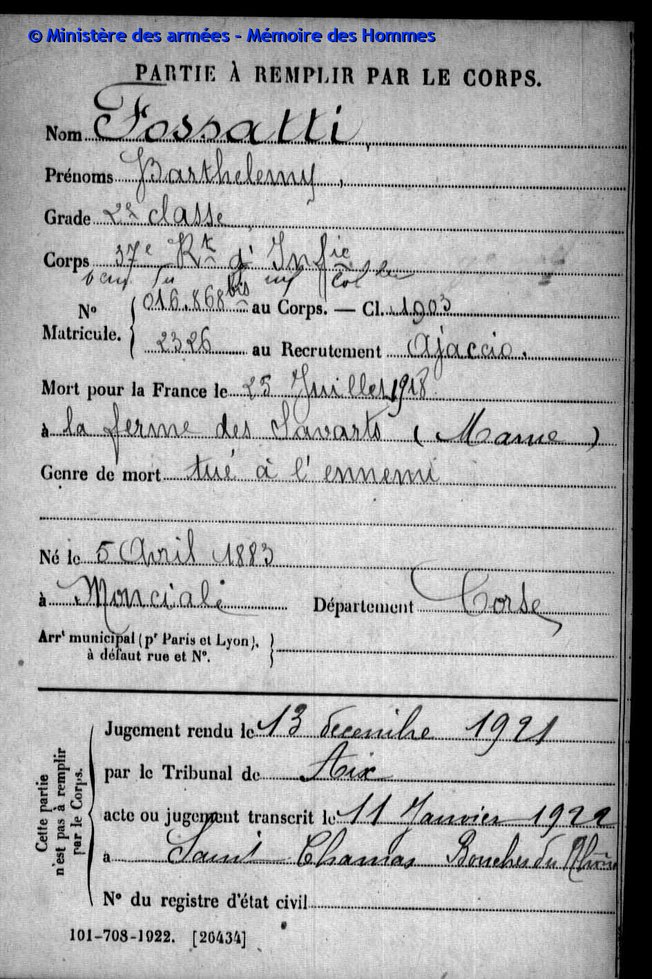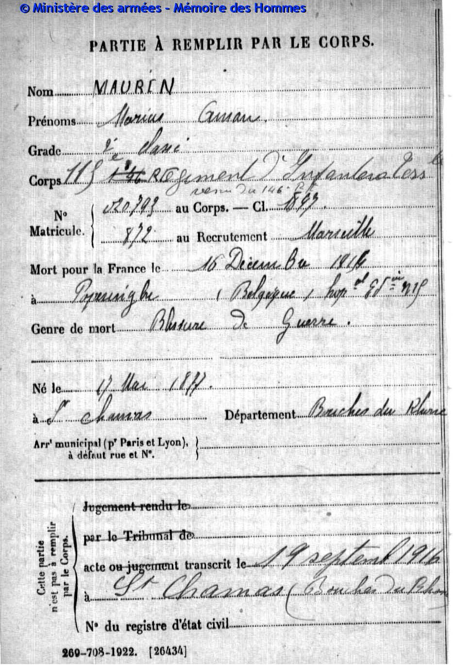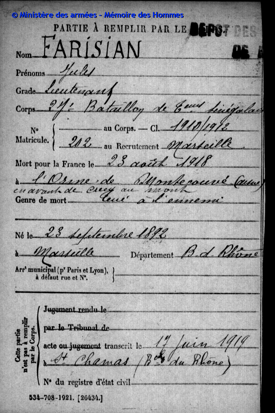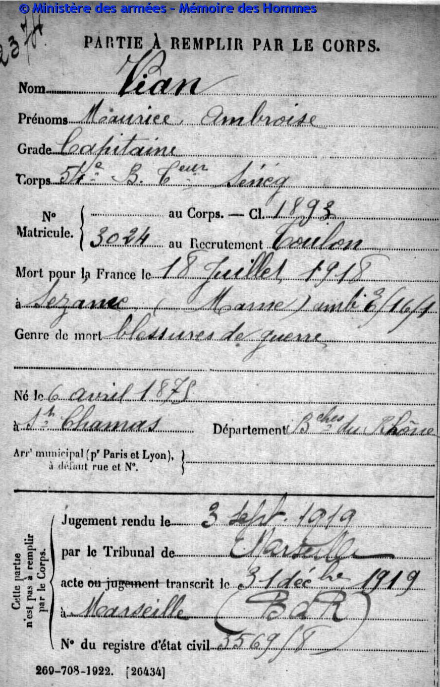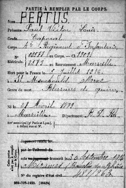 Jugement déclaratif de décès par le tribunal civil de Marseille le 3 septembre 1919, transcrit le 31 décembre 1919 à Marseille (Bouches-du-Rhône).