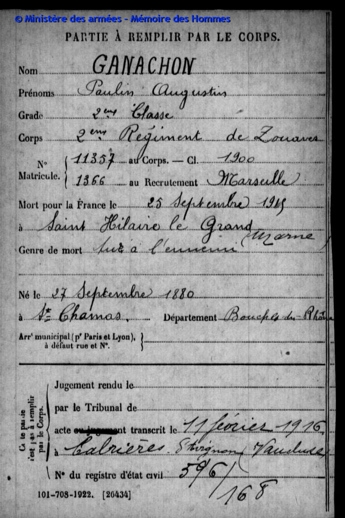Zouave de 2e classe au 2ebis régiment de Zouaves, matricule n°3155 au recrutement de Marseille, classe 1912.