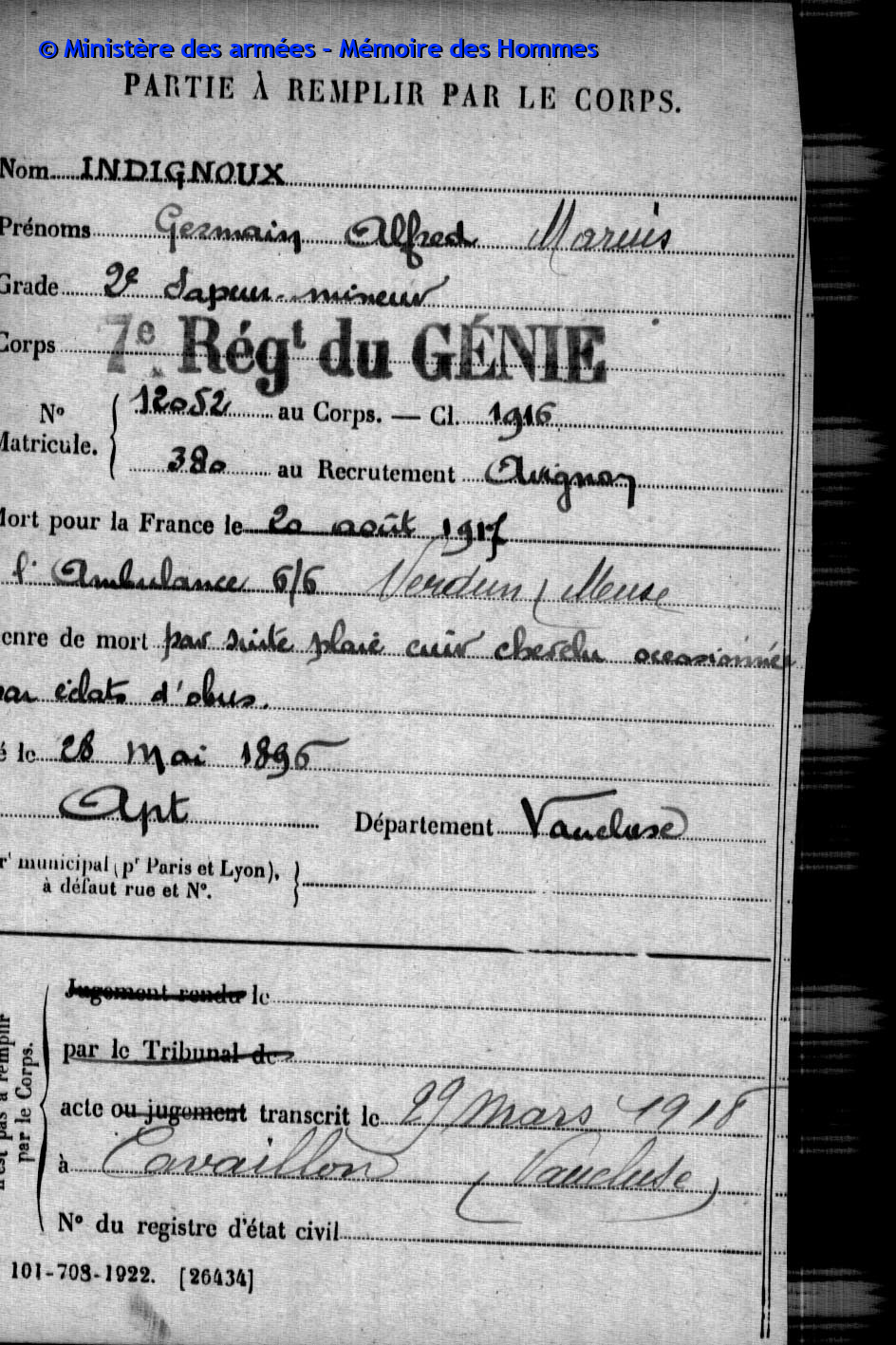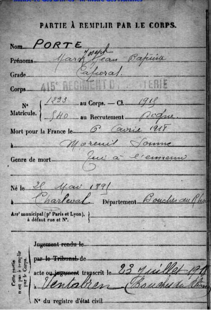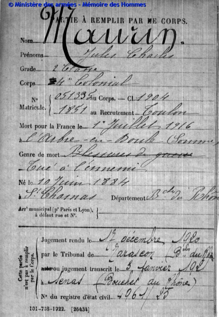 Jugement déclaratif de décès par le tribunal civil d’Aix le 29 juin 1920, transcrit le 27 juillet 1920 à Charleval (Bouches-du-Rhône).