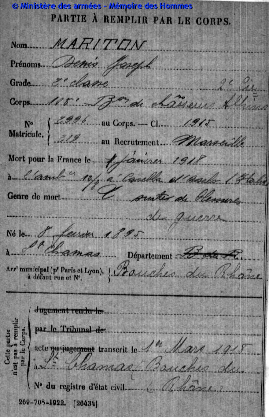 Chasseur de 2e classe au 30e bataillon de chasseurs alpins, matricule n°186 au recrutement de Marseille, classe 1915.