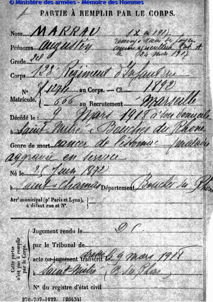 Acte de décès transcrit le 18 avril 1919 à Marseille (Bouches-du-Rhône).