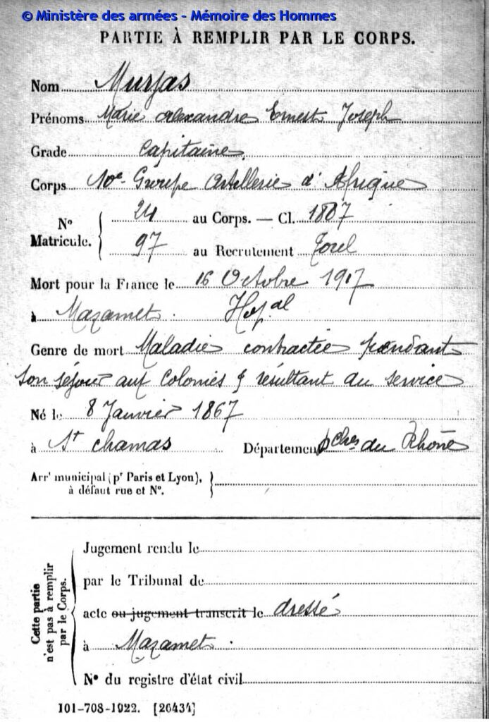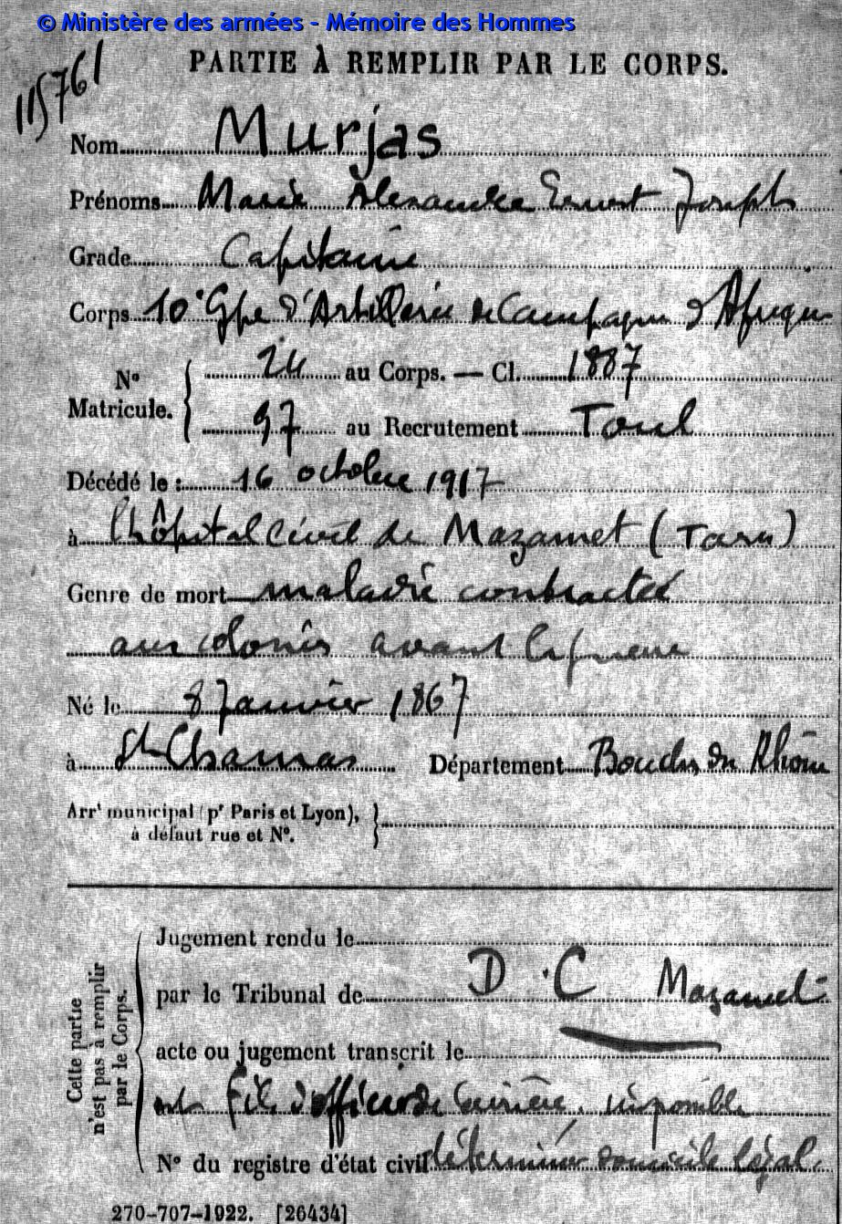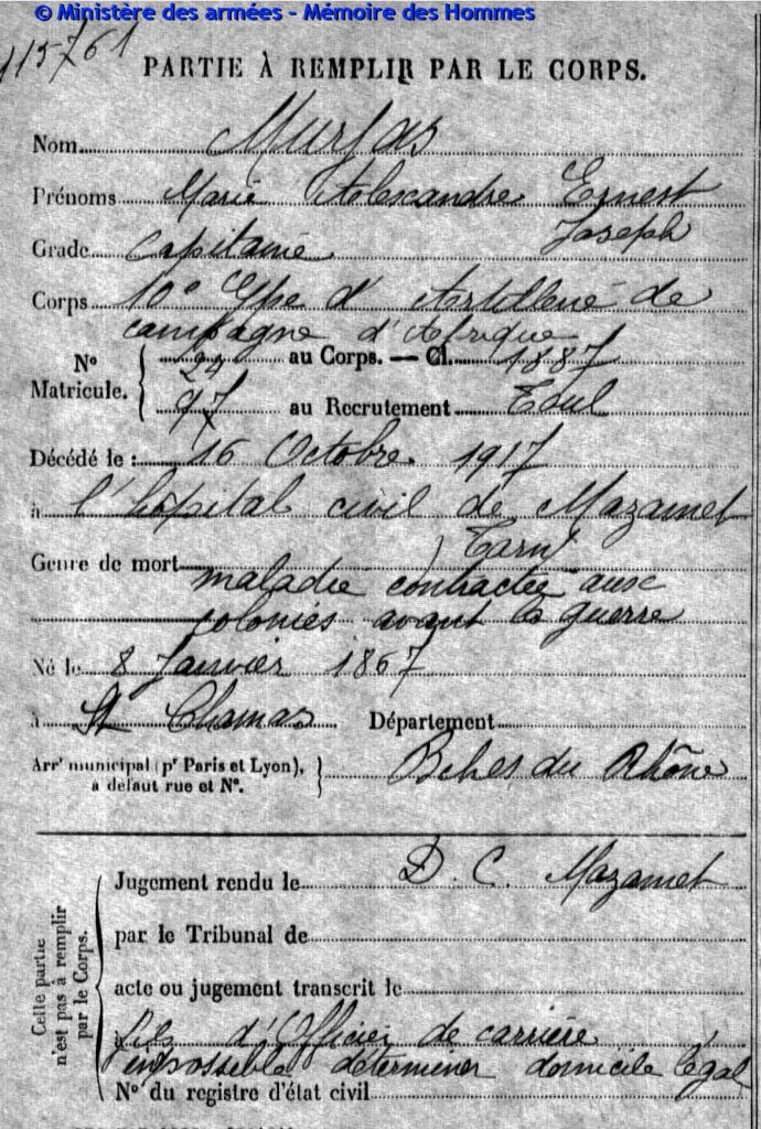 Capitaine au 56e bataillon de tirailleurs sénégalais, matricule n°1206 au recrutement de Toulon, classe 1892.
