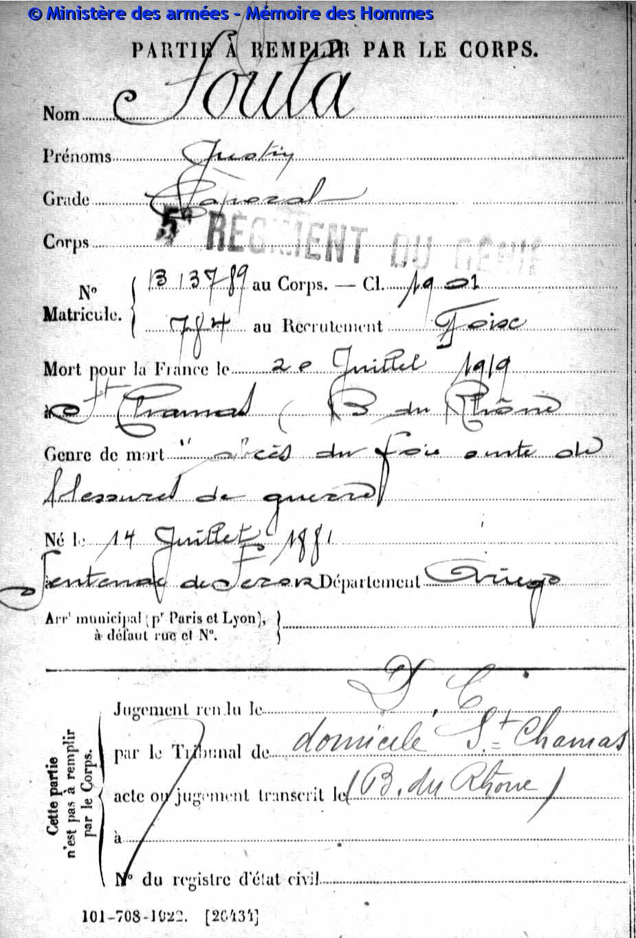 Mort pour la France, des suites de ses blessures de guerre, le 20 juillet 1919 à Marseille (Bouches-du-Rhône).